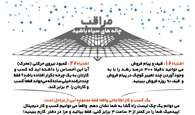 خیلی اوقات اطلاعات با یکدیگر در تضاد هستند. وقتی که تازه شروع می کنید ممکن است خیلی راحت در سیاه چاله (آن جور که ما اسمش را گذاشتیم) گم شوید. خیلی از مردم فقط می خواهند یک استراتژی انتخاب کنند و به همان بچسبند. هیچوقت بررسی نمی کنند که ببینند آیا این بهترین راه برای راه انداختن کسب و کارشان است یا خیر؟ به هر حال بعد از ساختن کسب و کارهای اطلاعاتی و فیزیکی به مدت بیش از 10 سال من بهینه ترین سیستم ممکن را دارم که به مراحل کوچکتری تقسیم شده است.